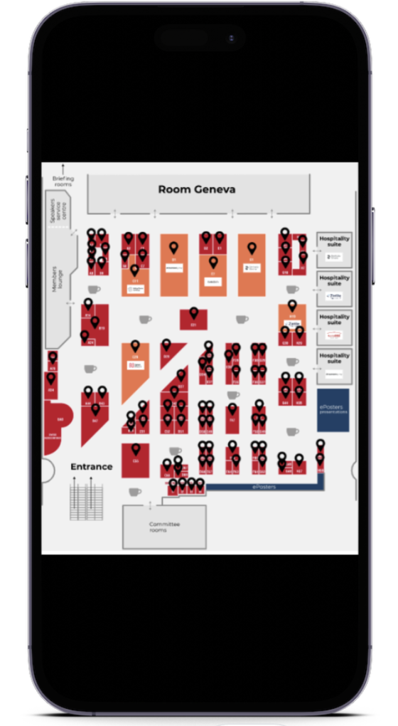 • Die Teilnehmer können ganz einfach durch die Veranstaltung navigieren, indem sie auf die Stände oder bestimmte Standorte auf dem Plan klicken. So können sie die Seite des Ausstellers interaktiv und intuitiv erkunden