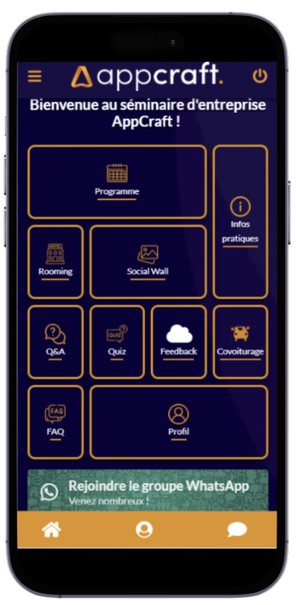 • Total Immersion:From the moment they launch the app, users are immersed in your world. No list of competing events, no generic menu. The UI/UX interface is tailored to your graphic charter, reinforcing your organization's sense of belonging and prestige. Available as a web app (no download required) or as a native app in app stores, your mobile solution becomes a natural extension of your corporate communications.