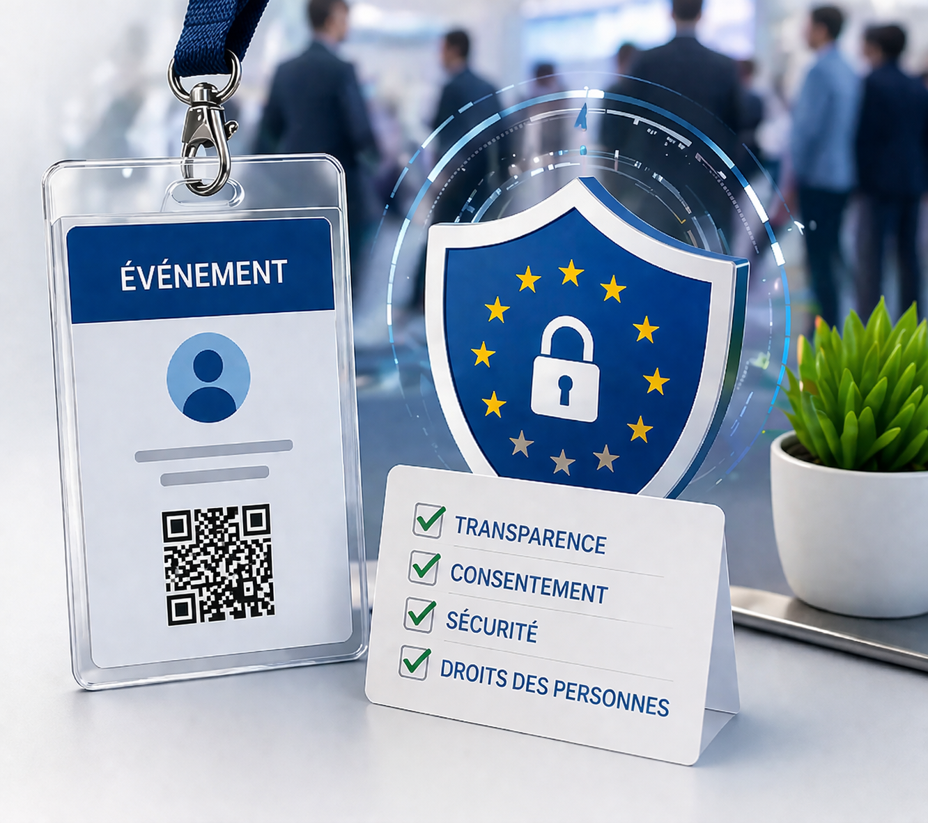Icône certification ISO 27001 symbolisant la sécurité de l’information, la protection des données et la gestion des risques informatiques.Icône GDPR représentant la conformité RGPD européenne et la protection des données personnelles dans une solution numérique sécurisée.Icône certification ISO 20121 illustrant la gestion responsable des événements et l’engagement en faveur du développement durable.