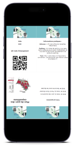 • Badge A4/A5 pliable imprimé par le participant avec mise en valeur du programme de l’événement (logo, date, QR code)