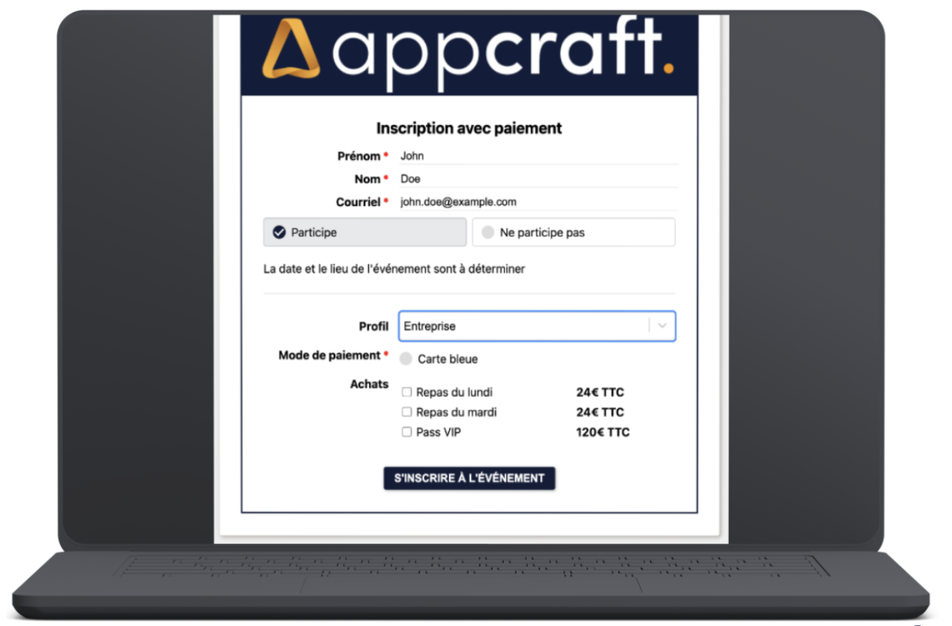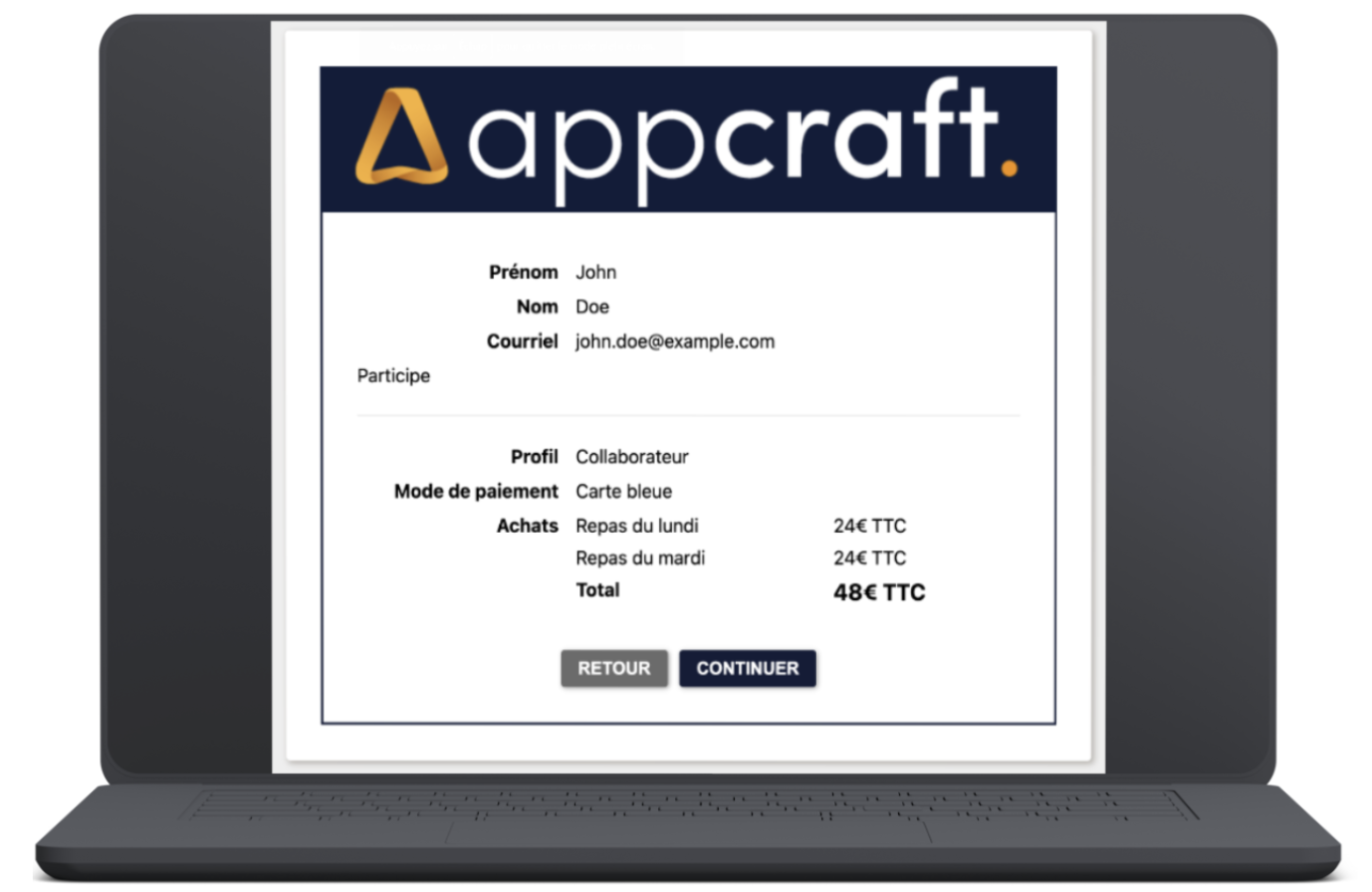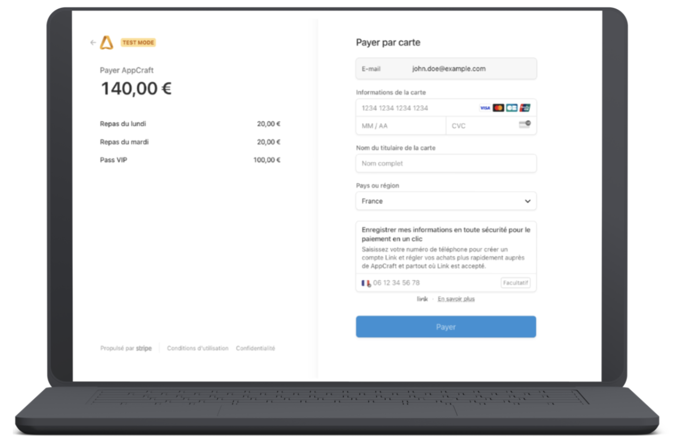 • Le paiement est réalisé sur une solution tierce du client branchée chez AppCraft (Stripe)