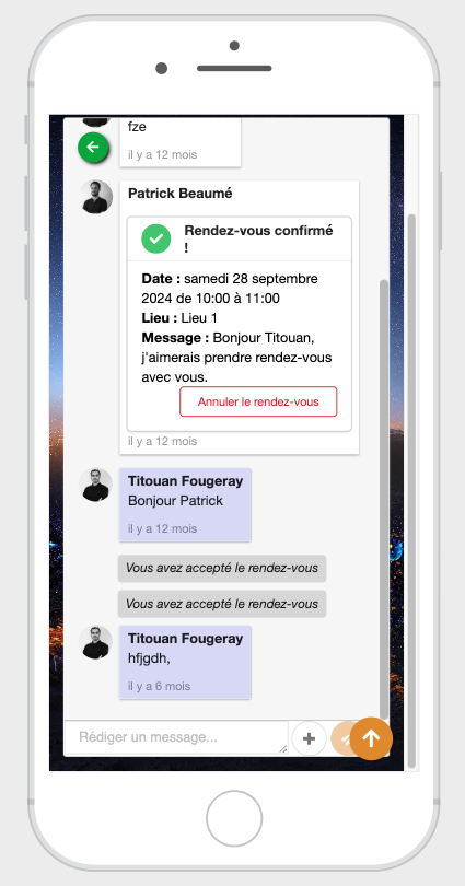 • Messagerie entre participants (sans diffusion de coordonnées) en one to one uniquement (pas de chat de groupe)