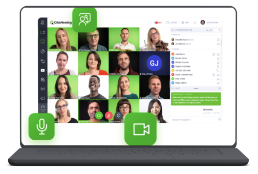 Interactivités incluses dans la visioconférence pour l’animateur : tableau blanc, lancer un sondage, partager son écran, diffuser des contenus (maximum 500 MO / fichier uploads en MP4) .