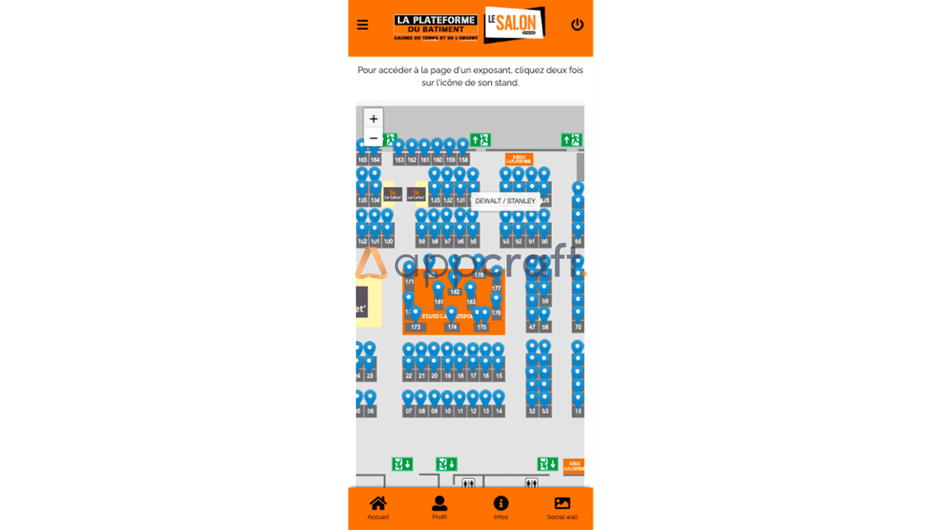 • Avoir une app mobile simple pour les collaborateurs, réunissant toutes les informations du salon (fiche, fournisseurs, plan, accès visiteurs/exposants…) et une partie gamification.