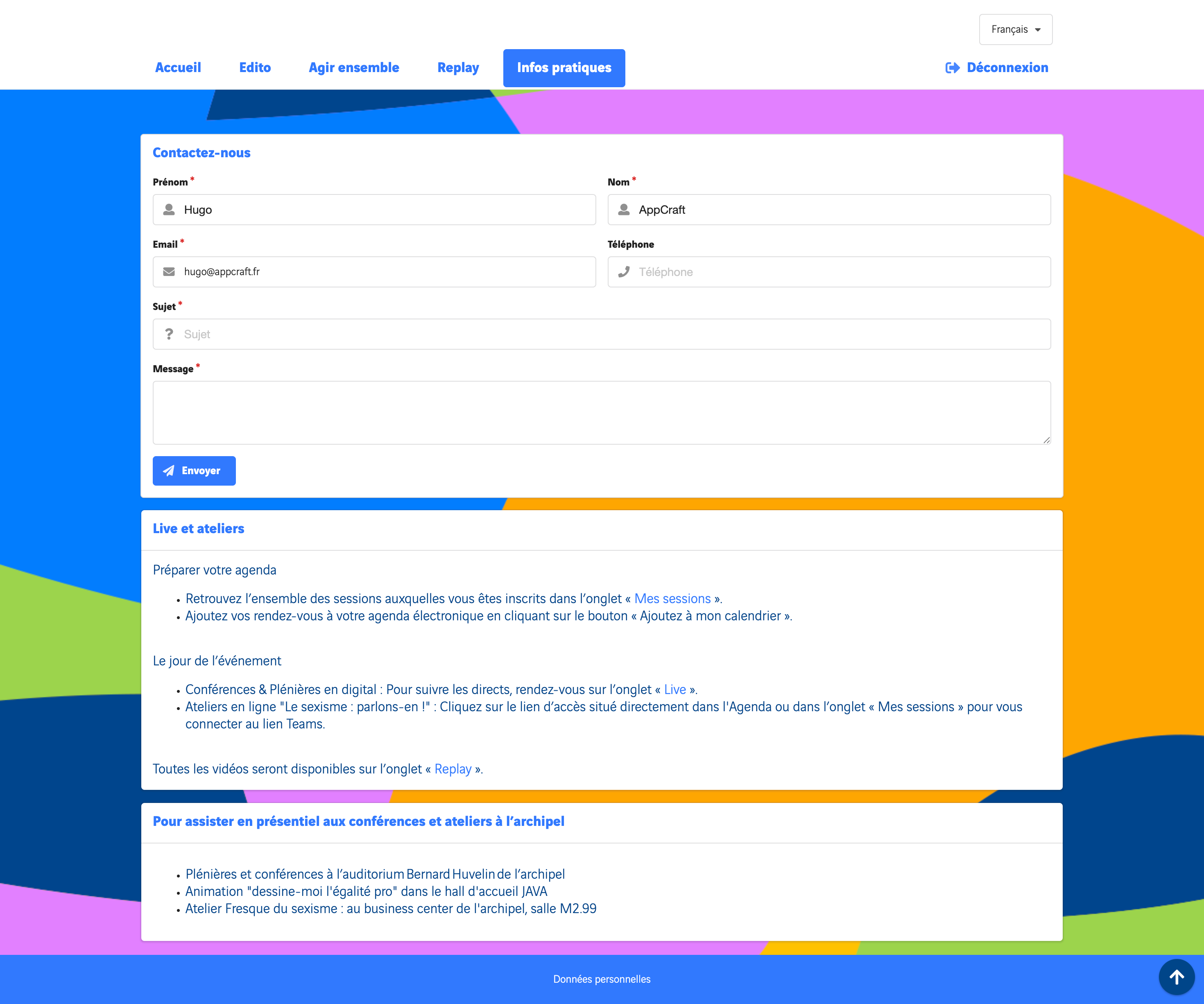 Un système d’inscription aux ateliers avec envoi automatique de confirmations et fichiers calendaires (ICS) a été intégré pour faciliter la gestion des participants.